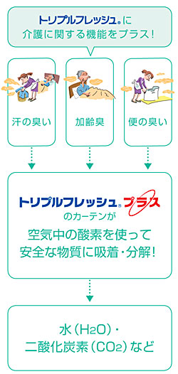 「トリプルフレッシュRプラス加工」 は、トリプルフレッシュRの機能に加 え、介護に関わりの深い3つの臭いに 効果を発揮。「加齢臭」(いわゆるおじさん臭)をはじめ、「汗臭」(靴下のむ れた臭いなどの汗による悪臭)、介護 現場では避けて通れない「便臭」を、す ばやくかつ持続的に、吸着・分解して 消臭。電気や光を使うことなく、24時 間、繰り返し消臭効果を発揮します。